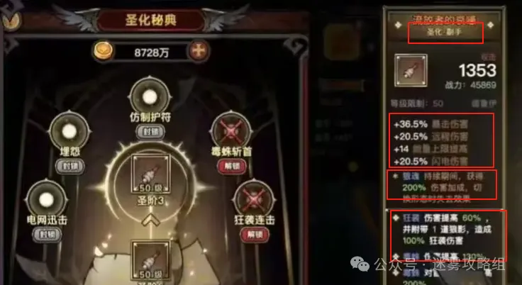 如上图,每个圣化装备,都有4个基础词条,除词条外,还有对应职业的5个技能,每个技能都有不同的效果,如狂袭(伤害提高并附带狼影)……这应该是德鲁伊的圣化技能,就看到时候具体是什么形式携带了。