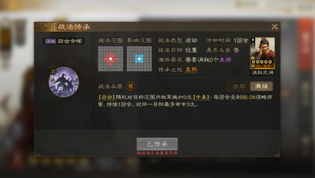 但是四世余晖现在的伤害总倍率提高,打满就是88%X5=440%,所以对于周瑜和程昱来说还算是可以用的战法,只是不能触发被动了,而且要等过回合结算才能出伤。