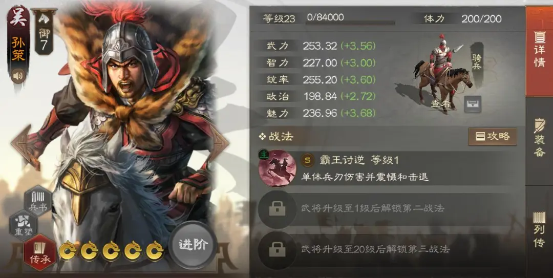 孙策,吴国7御骑兵,本身的属性算是比较优秀的一档。