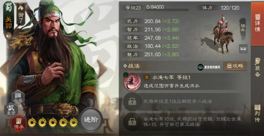 关羽,蜀国7御骑兵,武力与统率成长较高,但智力成长一般。