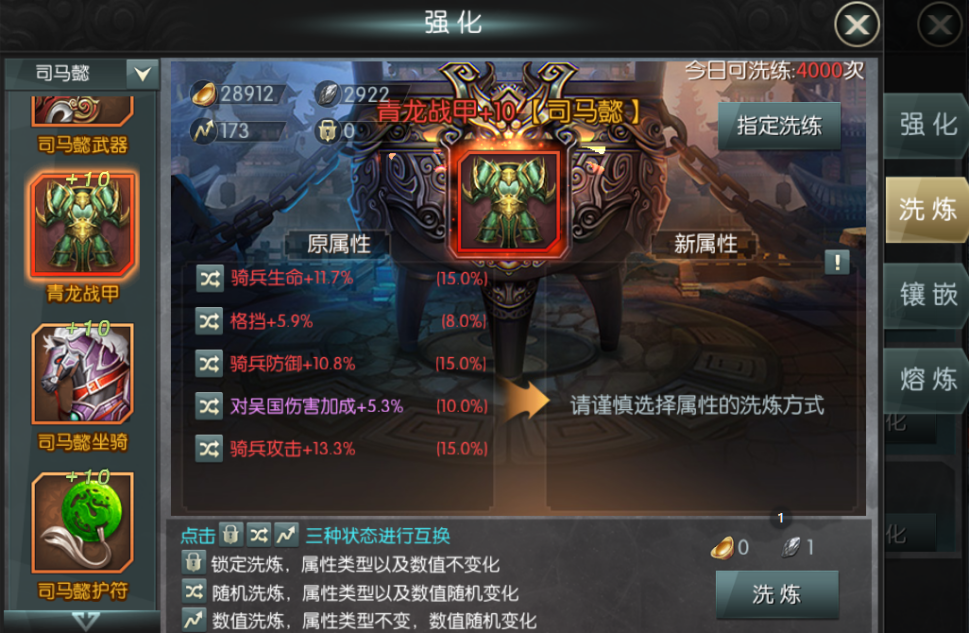 2. 洗练属性中有三个属性必须为兵种的加成,这三个就是对应你的武将所带的兵种,分别有(骑兵,弓兵,步兵)一定要洗练到你相对应的兵种,若你的武将带的是骑兵,就一定要把4件装备洗练到骑兵的加成,给武将最大值的(生命,防御,攻击加成)。
