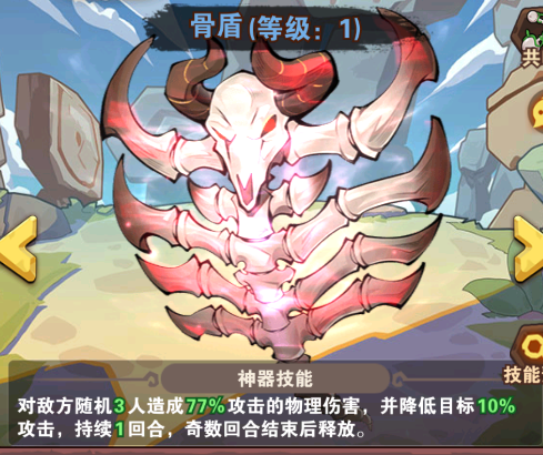 骨盾:对敌方随机3人造成77%攻击的物理伤害,并降低目标10%攻击,持续1回合,奇数回合结束后释放。