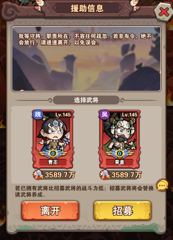 援助武将,往往比自己带的武将弱一点,低战力的可根据自身阵容选武将援助,可以更轻松的通过拿到奖励