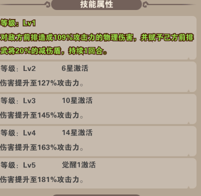 技能:对敌方前排造成伤害,并为已方前排赋予减伤盾