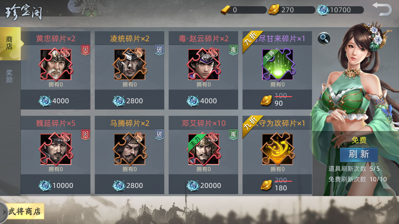 2、珍宝阁:珍宝阁中第一个就是“武将商店”,这个是重点哦!一定要用小笔记下来,每天都要记得来这里换东西,记得要刷新哦,你会发现没几天就可以合成一个整将了。