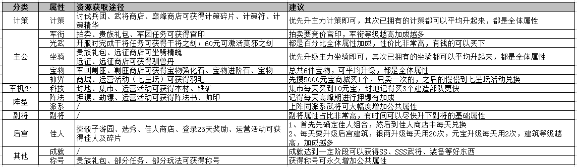 可以通过以下途径提升公共属性,即全体武将属性获得提升,小编分别列出对应系统及资源产出途径仅供参考: