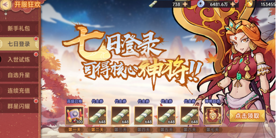 3、开服前七日领取丰富奖励,第七天再送神将自选