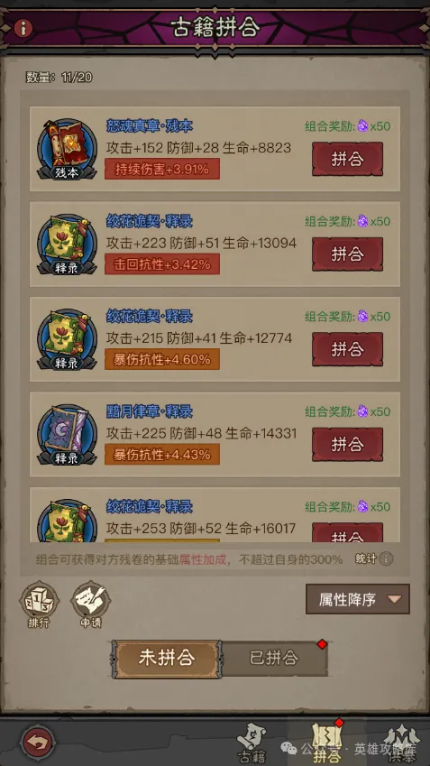4、研读完毕的估计可以进行拼合,拼合的对象可以为当前区服玩家、公会内玩家、指定玩家;拼合后,可以将对方古籍的基础属性按比例增加到合并后的密卷中,同时高级属性也将新增到拼合后的密卷中。如果对属性有要求的小伙伴,可以通过聊天寻找合适的人选,通过指定的方式合并手中持有的珍贵古籍