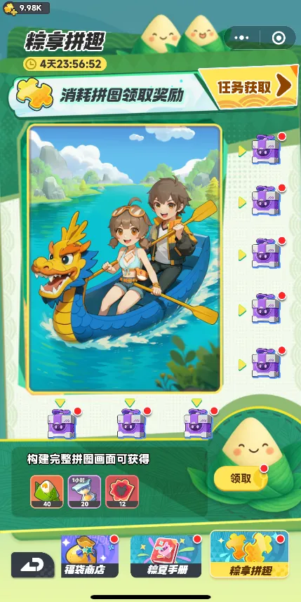 ※ 终极解锁奖:拼完整张拼图,还可领取额外奖励!红品信物、加速道具通通安排,更包含「龙舟竞渡」活动所需的粽子材料,助力划船快人一步!