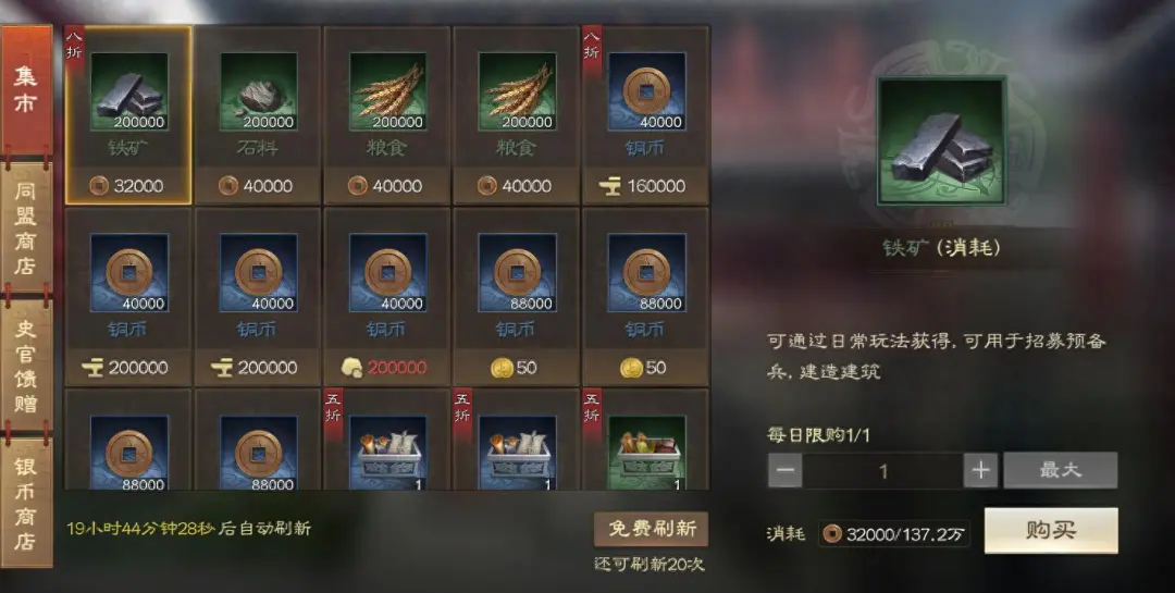 在赛季中后期,建议目前可以把资源换铜钱的能买多少就买多少。每周把同盟商店需要的战功打完之后就可以不用拼命刷战功了,把资源换铜币,然后攒紫卡,为下赛季开荒做准备了。